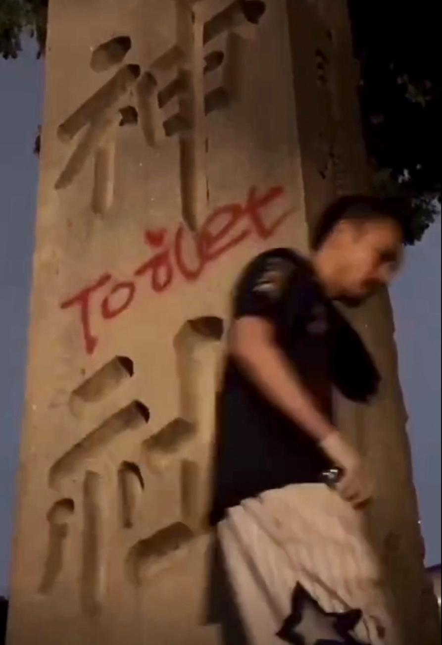 6月1日早上6時,有日本民眾發現靖國神社刻上社名的石柱被人用噴漆涂鴉,寫上“toilet”(廁所)一詞。 當局調閱監視器追捕犯人之際,中國網紅鐵頭公開拍下犯案過程的影片,聲稱是為了排放核污水一事“給它們點顏色瞧瞧”。 該網紅有不少黑歷史,年初才因為在直播中自曝買春,遭各平臺封號禁言。