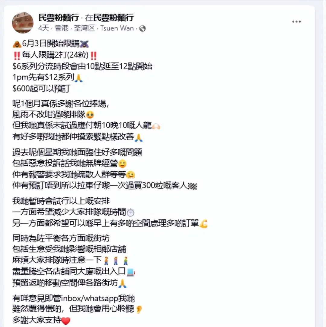 民豐粉面行在社交平臺上更表示,曾有客人因為預訂不到,而選擇拉車子到店一次性買300粒糯米滋,進一步增加其他客人排隊的時間。更有被惡意投訴“無牌經營”、報警要求疏散人群等。