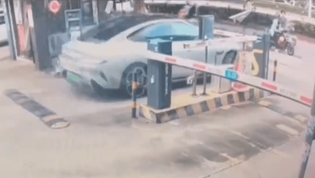 閉路電視影片顯示,這輛小米SU7持續加速沖出停車場出口柵欄,隨即撞到行經慢車道的電動單車與路人,接著跨越分隔島后才停在快車道上。