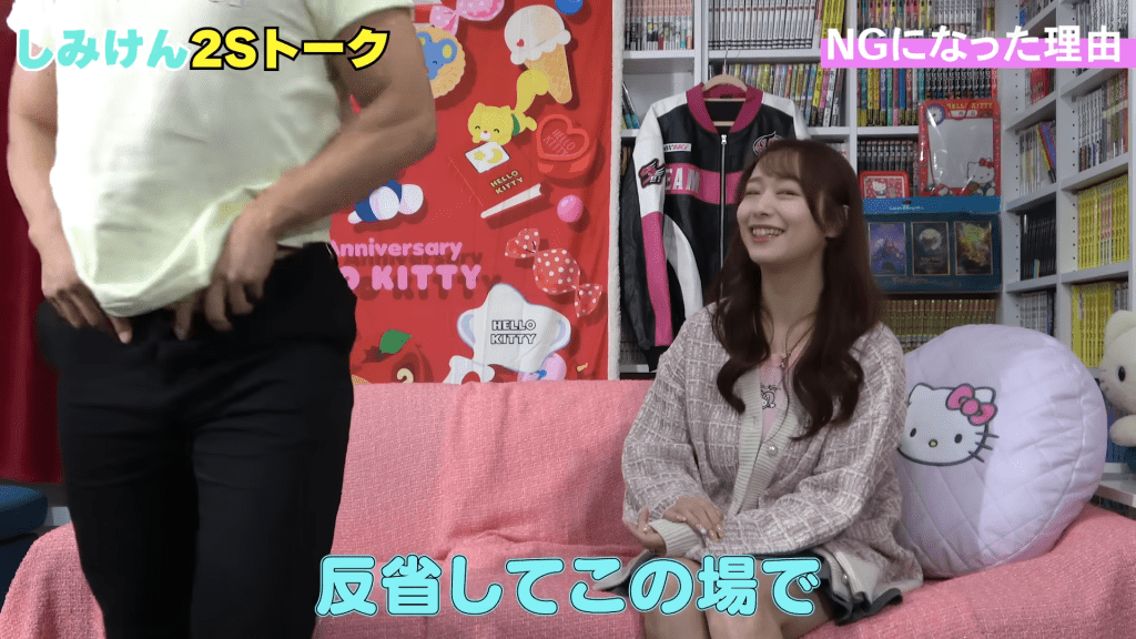 白石茉莉奈還在影片中親自示范清水健當時的動作,伸手掐清水健的胸部,讓觀眾更快明白當時的情形,清水健被摸得害羞不已,忍不住自嘲“羞恥、差勁”,并親口向白石茉莉奈道歉。