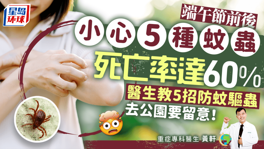 重癥??漆t生黃軒在其facebook專頁發文指,隨著端午節到臨,亦代表氣溫會變得越來越熱,屬蚊蟲活躍的季節。 端午節過后,各種小蟲開始亂竄,大家到戶外活動時,被咬的風險也隨之增加。 他指出,這個時節較常被5種蚊蟲叮咬,可引致皮膚發炎或嚴重的疾病。