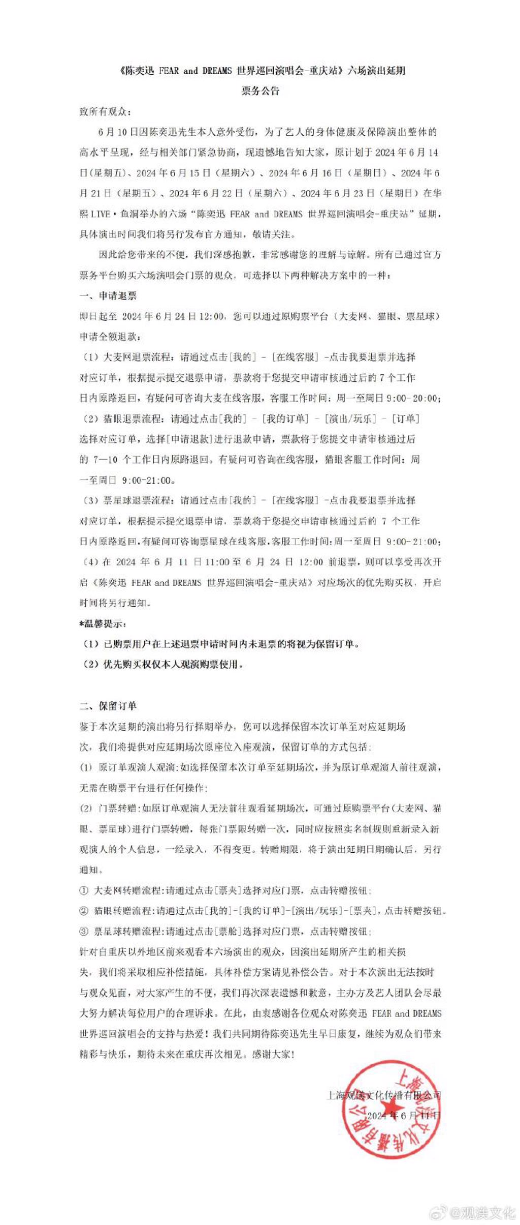 關于延期和補償方案,主辦單位表示開放歌迷進行全額退票,倘若愿意保留票根等到2025年演唱會重啟,不僅能保留對應場次的座位,從外地前往重慶觀賞的歌迷,將采實報實銷方式補貼交通以及住宿費用,對于造成眾人不便感到非常抱歉,也會盡全力完成所有人合理訴求,等待陳奕迅康復后,再次于重慶與所有人見面。