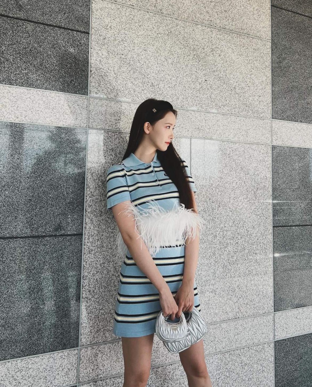韓星允兒以Polo Shirt及迷你裙,襯以Miu Miu黑色粗發箍,造型充滿學院風格。 (圖片來源:IG@yoona__lim)