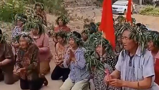 網傳影片顯示,有民眾頭戴樹枝編織的草帽,跪拜在龍王廟前求雨。有村民口中念念有詞,祈求老天降雨救莊稼免于枯死。