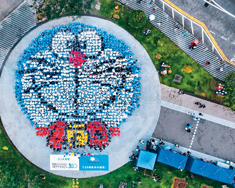 ▲近1,500名學生和義工穿上多啦A夢主題顏色的衣服和帽子,有序排列拼出展覽主題多啦A夢頭像。