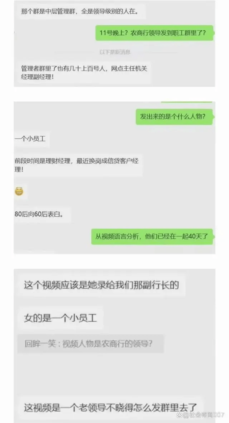 另外,網傳一段聊天截圖顯示,拍攝影片的女主角是該行的一名小職員,而那個群是該行的中層管理群,全都是領導級別的人。有人從影片內容指出。他們已經在一起40天了,更有人聲稱女職員的老公也在群里,2人皆已婚,疑似出軌。