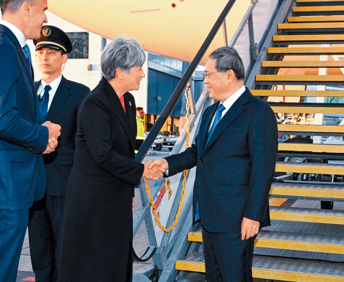 ▲總理李強昨日抵達阿德萊德,澳洲外長黃英賢接機。