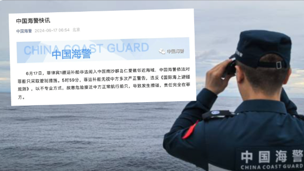 據中國海警微信公眾號17日消息,6月17日,菲律賓1艘運補船非法闖入中國南沙群島仁愛礁鄰近海域,中國海警依法對菲船只采取管制措施。5時59分,菲運補船無視中方多次嚴正警告,違反《國際海上避碰規則》,以不專業方式,故意危險接近中方正常航行船只,導致發生擦碰,責任完全在菲方。