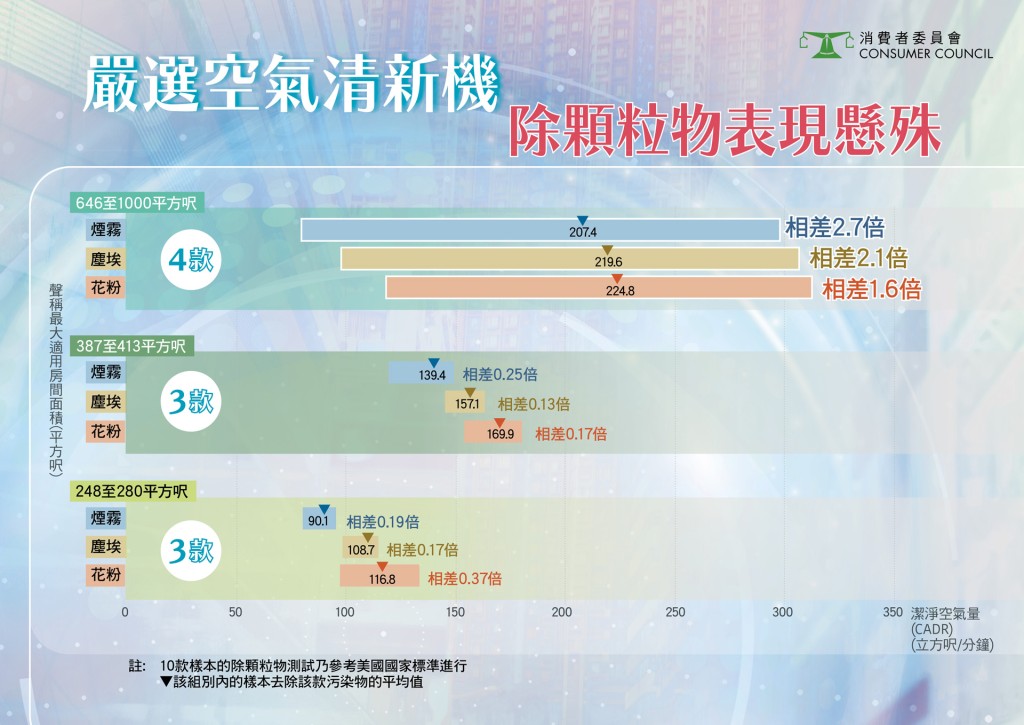 消委會測試后發現,空氣清新機的首要功能當然是凈化空氣,例如去除空氣的顆粒物如煙霧、塵埃及花粉。測試量度各樣本去除顆粒物的CADR,數值愈高,表示凈化速度愈快,凈化能力愈好。