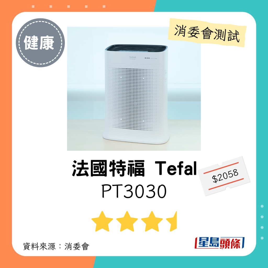 ▲法國特福 Tefal(型號:PT3030):最大適用房間面積介乎387-413平方呎平方呎。