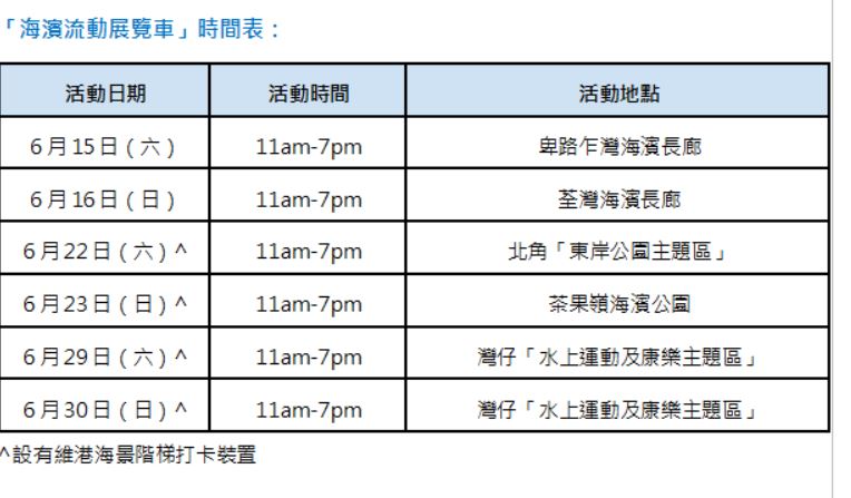另外,由6月15日起連續三個周末,“海濱流動展覽車”將快閃港九新界海濱長廊,介紹海濱發展理念和進程,并以精彩短片展示海濱發展點滴。參觀者更可參與扭蛋問答游戲和水波畫工作坊,只要在指定時段完成小任務,即可現場獲贈免費雪糕、曲奇或小禮品,6月22日起同場還有維港海景階梯打卡裝置。每日名額或數量有限,先到先得,送完即止。