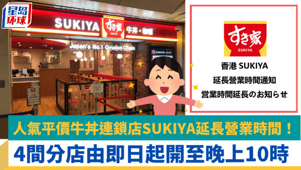 人氣日本平價牛丼連鎖店SUKIYA(すき家),主打平價日式丼飯,有招牌牛丼、牛燒肉丼、炙燒豚丼等,以親民的價錢深受香港市民歡迎,經??梢钥吹介T外長長的排隊人龍。近日,SUKIYA宣佈由6月17日起,4間分店將會延長營業時間,開業至晚上10時。