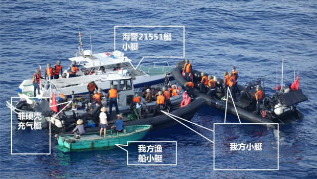 ▲中國海警在仁愛礁海域登上菲軍方快艇檢查。