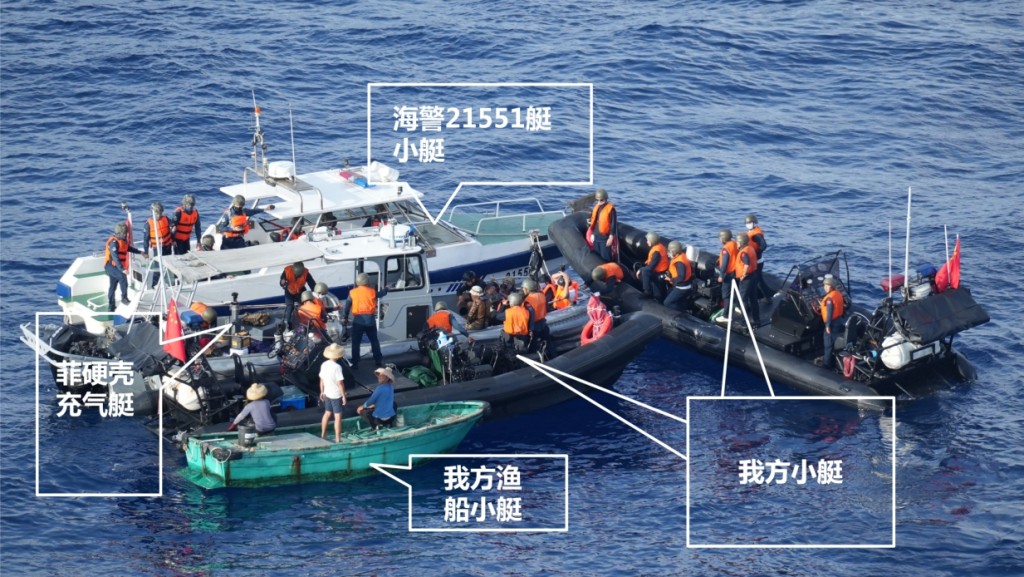 ▲中方公布,中國三海警快艇和一漁船將菲方船包圍,中國海警并登上菲方的船檢查。