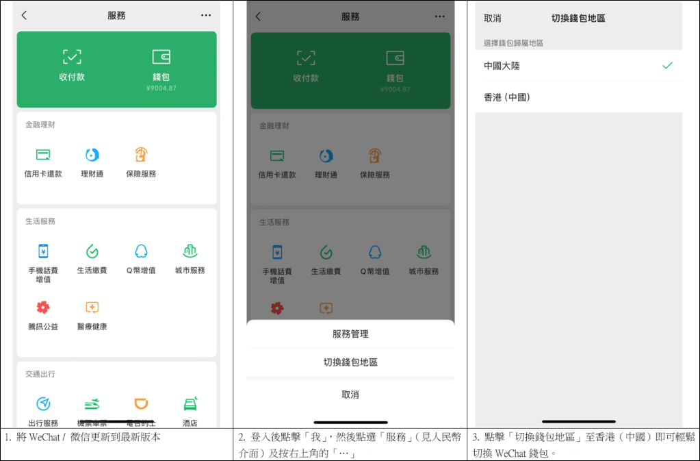 若用戶同時擁有微信支付及WeChat Pay HK,可隨時切換錢包地區進行轉換,只要看清楚錢包余額顯示人民幣還是港幣,即能輕易分辨微信支付或WeChat Pay HK,切換步驟如下︰