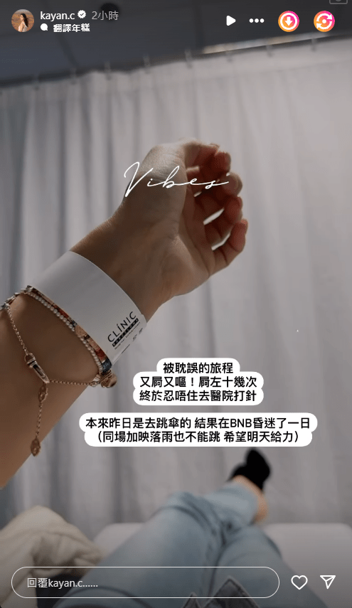 富貴人妻蔡嘉欣今日在IG的限時動態連發三帖,她先貼出入醫院打針照,并寫上:“被耽誤的旅程,又疴又嘔! 疴咗十幾次,終于忍唔住去醫院打針,本來昨日是去跳傘的,結果在BNB昏迷了一日(同場加映落雨也不能跳,希望明天給力)?!?照片可見蔡嘉欣躺在病床上,手系上入院紙環。 之后她轉發了好友的限時動態,并寫上:“復活了,本來今朝仲以為出唔到去要喺屋企攬住個廁所”,她亦透露原來他們同行的人都一齊食物中毒。 及后她貼上行街影片,寫上:“雖然仲是無胃口,但頂硬上! 希望我不要再肚疴吧!“。