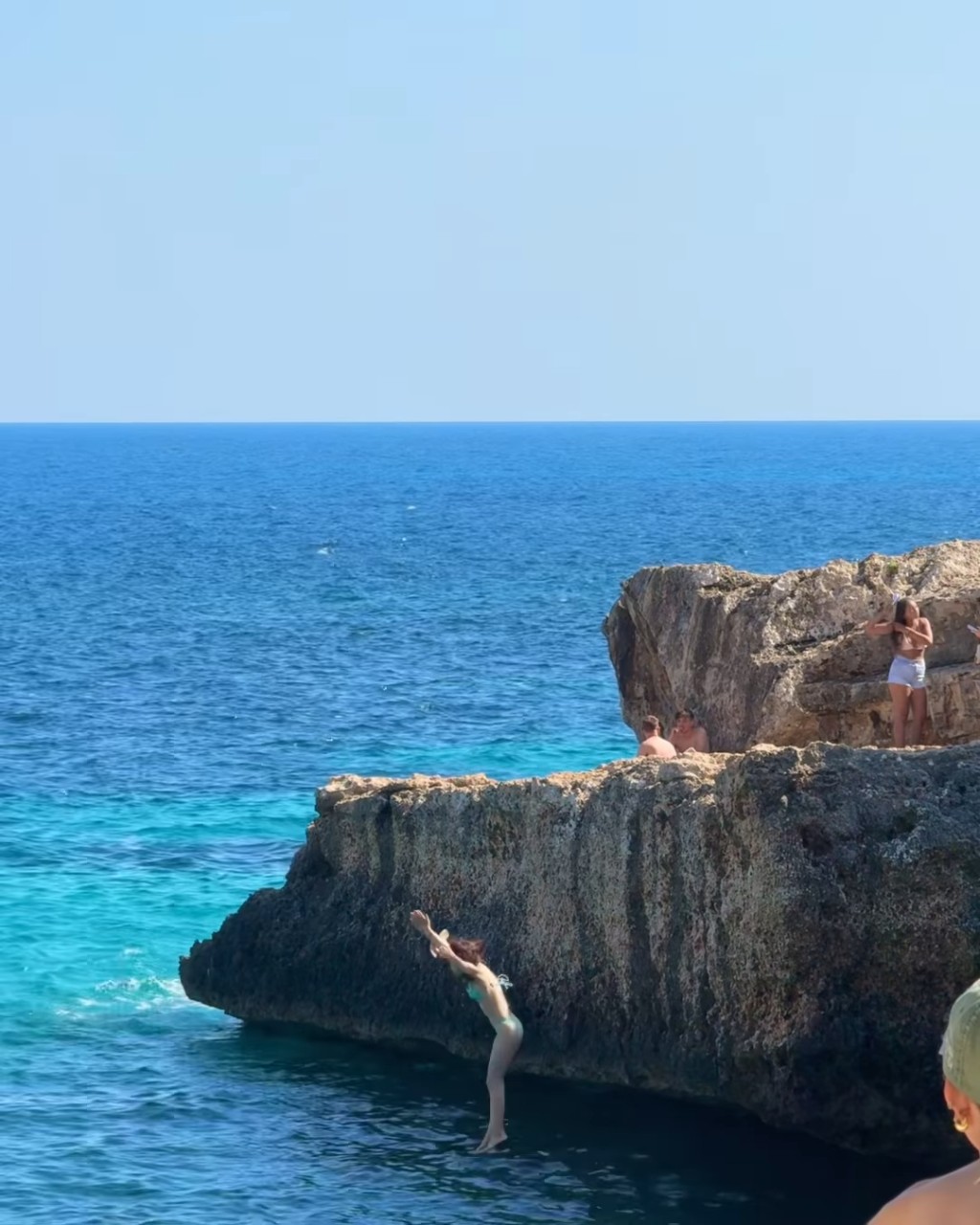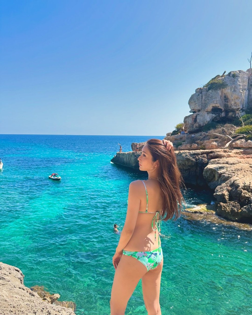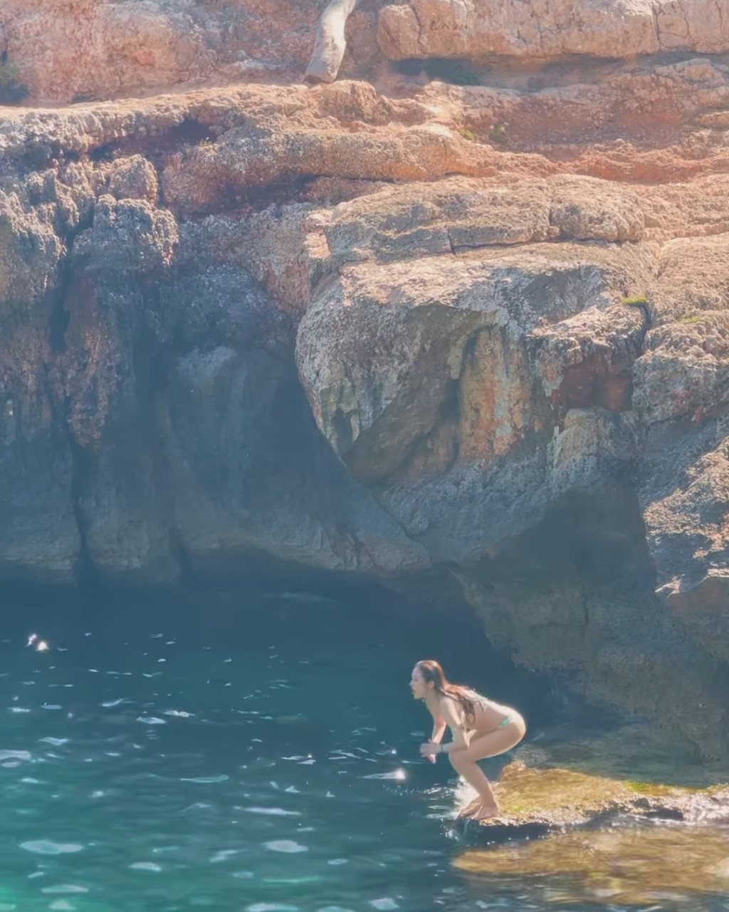 蔡嘉欣今日亦有在IG貼出泳衣照及跳崖影片,她寫道:“Mallorca Crystal Clear 果凍海,真的絕美,游了幾圈泳,跳了個崖,拍了幾圈航拍,真想在這個海洋待更久!” 從相片上看到身穿綠色兩件頭泳衣的蔡嘉欣在崖邊拍照,影片則看到蔡嘉欣跳崖,她準備跳崖時,先抽高三角泳褲,然后一躍而下,跳入大海! 網民也替她汗顏,留言指她“好大膽”,“撻水皇后”、“Kayan好靚好sexy,美人美景,你跳水跳得好好睇,你正側面好靚?!?/p>