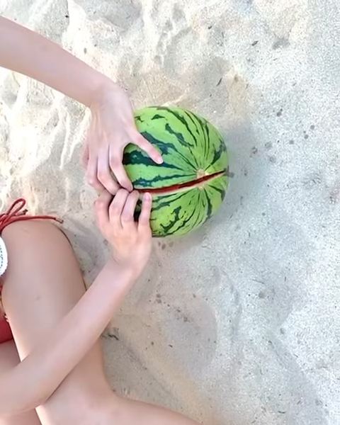 ▲影片見到游嘉欣輕松將西瓜一分為二,網民都驚訝游嘉欣的神力,更指她瘦了很多。