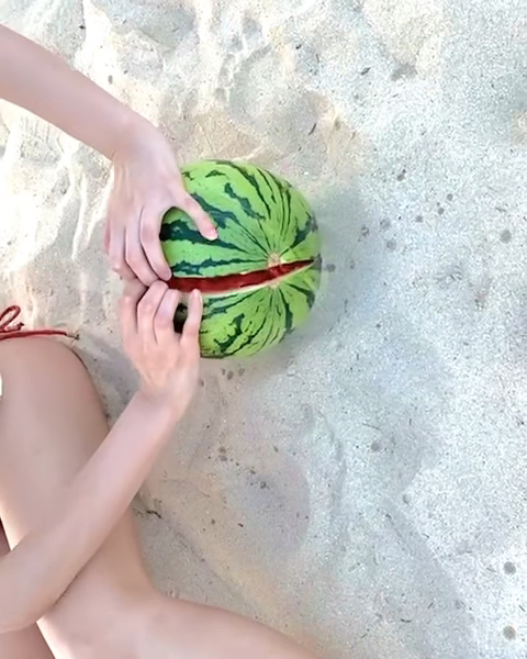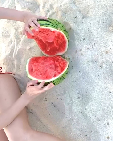 游嘉欣昨日(21日)在IG大派福利,穿上有如肚兜的掛頸小背心配熱褲,坐在沙上大曬性感鎖骨、香肩和白滑長腿,更將一個西瓜抱在胸前,向鏡頭單眼,非常誘人。游嘉欣發文解釋:“一早已經想試下買粒西瓜喺沙灘食,事實證明野外開西瓜系唔需要有工具,只需要力量,掉落沙再用手拉開,做左甘耐gym就系為咗呢一刻hahahaha。