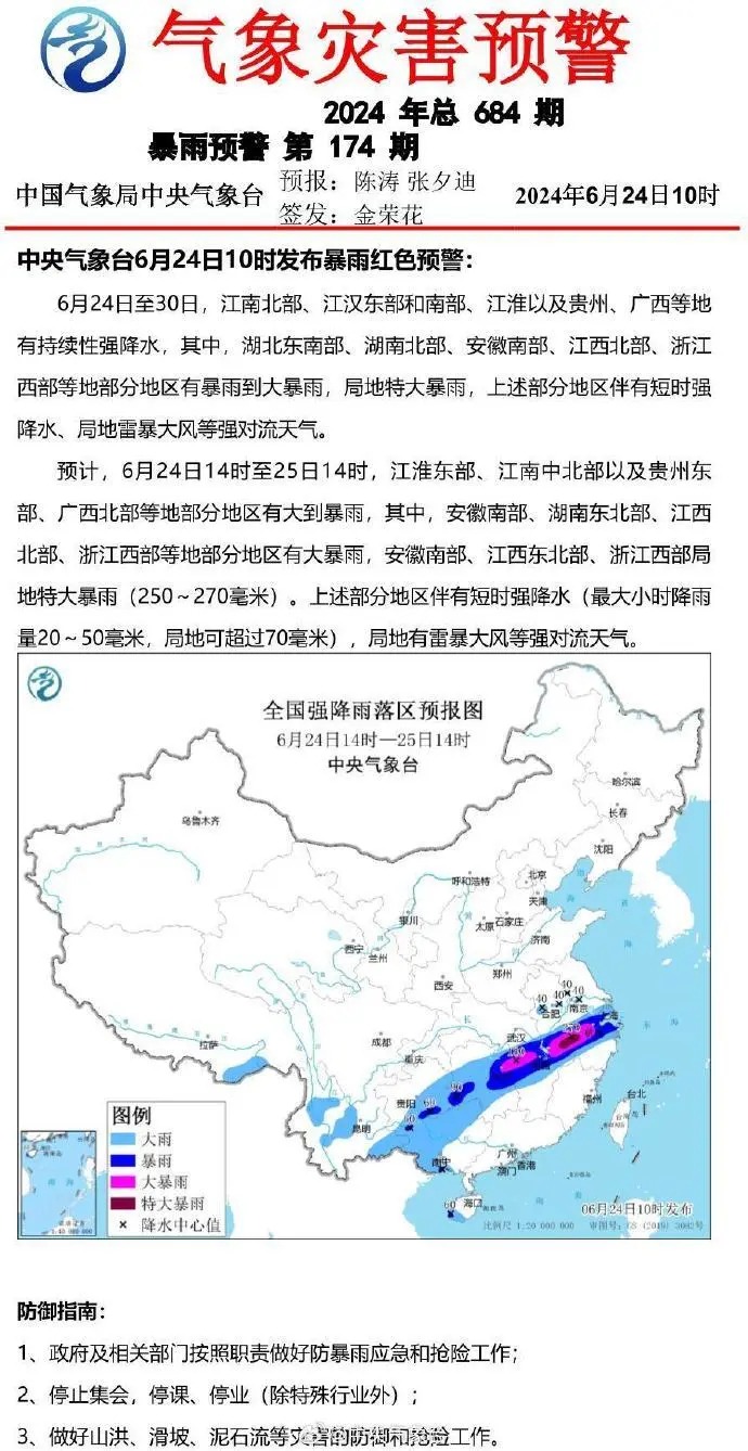 6月24日至30日,江南北部、江漢東部和南部、江淮以及貴州、廣西等地有持續性強降水,其中,湖北東南部、湖南北部、安徽南部、江西北部、浙江西部等地部分地區有暴雨到大暴雨,局地特大暴雨,上述部分地區伴有短時強降水、局地雷暴大風等強對流天氣。