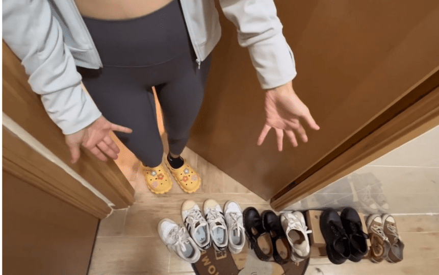 片中所見,她以$5,300月租的100呎的劏房單位,甫開門的左邊就是獨立廁所,但沒有干濕分離,并需要利用鏡后的柜及假天花來擺放番梔、廁紙等雜物。 大門亦不能完全打開,因門后擺放了袋、雨傘等物件。 玄關位則放了一個小衣架作為“迷你衣帽間”,掛了她和男友的衣服、襪及污糟衫等。