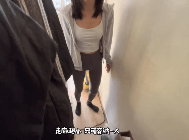 ▲她揶揄“走廊激細,只可容納一人”,而且“較肥的人要貼住墻行”,令墻身發黑。