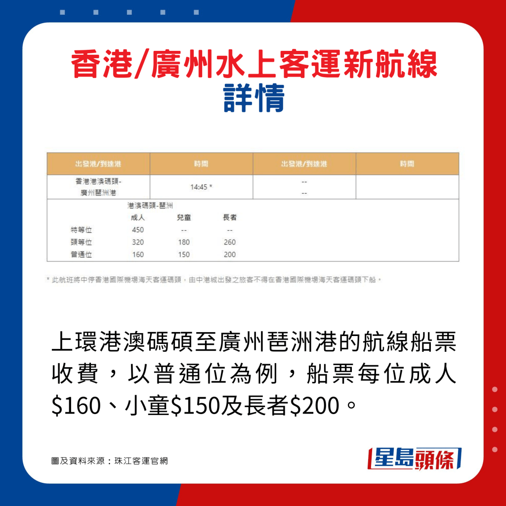 ▲上環港澳碼碩至廣州琶洲港的航線船票收費,以普通位為例,船票每位成人$160、小童$150及長者$200。