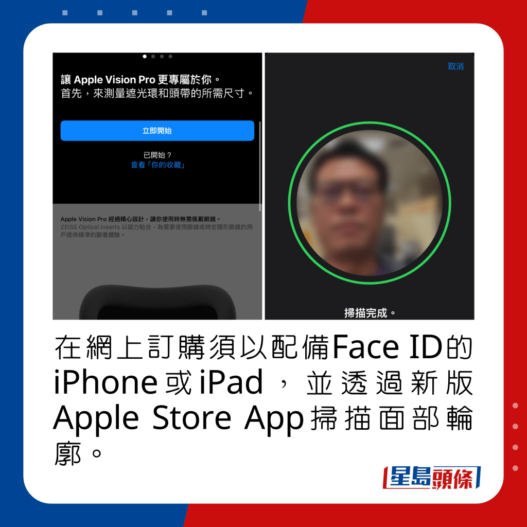 Vision Pro現可于Apple Store門市或網站直接訂購,要有最貼身舒適的佩戴體驗,遮光環及頭帶尺寸均要非常準確,故在網上訂購,需要利用配備Face ID的iPhone或iPad,以及最新版本《Apple Store》App,完成面部掃描; 如前往門市,Apple Specialist會協助閣下完成類似掃描程序,由系統決定判斷最合適的尺碼。 如有矯視需要,好像近視或老花,果粉可額外購買ZEISS Optical Inserts鏡片,網上訂購的話要預先提供度數信息,店內則可以直接量度所佩戴的眼鏡度數。 成功入手Vision Pro后,Apple會提供一個免費網上環節,讓用戶進一步了解裝置本身、佩戴調校及操作visionOS。