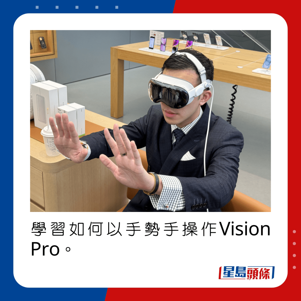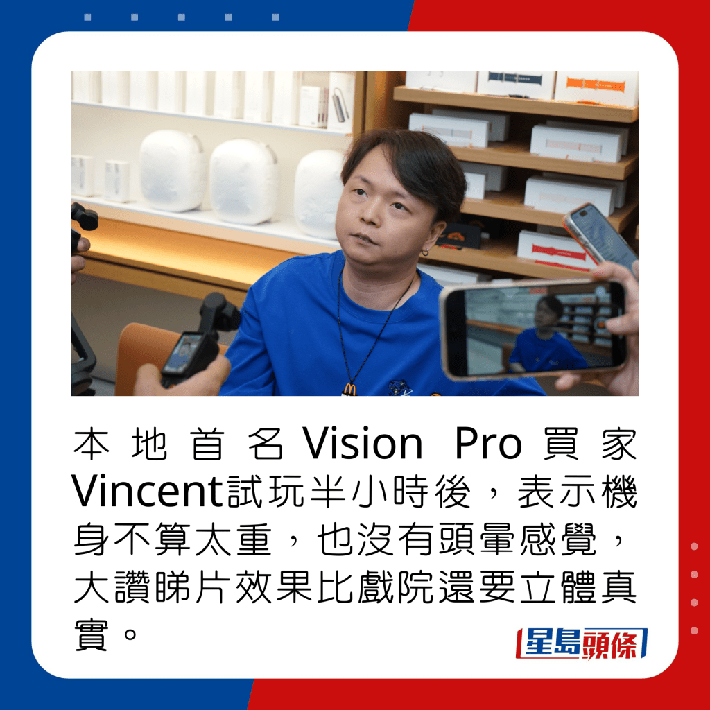 本地首名Vision Pro買家Vincent試玩半小時后,表示機身不算太重,也沒有頭暈感覺,大贊睇片效果比戲院還要立體真實。