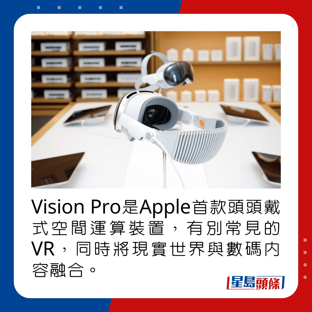 ▲Vision Pro是Apple首款頭頭戴式空間運算裝置,有別常見的VR,同時將現實世界與數碼內容融合。