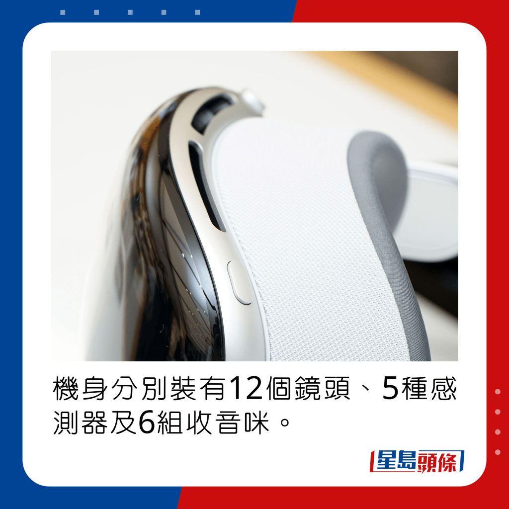 話說回來,Vision Pro用上鋁合金外殼,前方裝有整合3D顯示器的微曲玻璃,編織物遮光眼罩及頭帶均有不同尺寸選擇,確保佩戴舒適穩固。 為實時感知外部環境,以及追蹤眼球及手部動作,機身分別裝有12個鏡頭、5種傳感器及6組收音咪,眼罩內部亦有紅外線鏡頭及LED光束發射器,用戶可以利用眼睛、雙手及聲音以最直覺方式來操控。 另Vision Pro配備雙micro-LED屏幕,像素高達2,300萬,影像清晰銳利。