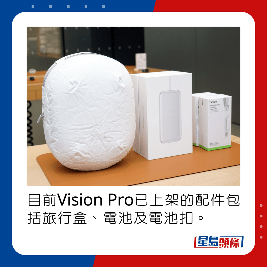 ▲目前Vision Pro已上架的配件包括旅行盒、電池及電池扣。