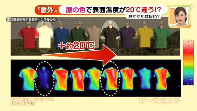 日本夏天炎熱程較香港有過之而無不及,為了消暑解溫,大家都會從衣著上入手,除了穿得透薄“少布”,顏色原來對于“吸熱度2有重要影響。日本電視節目《メ~テレニュース》就曾經進行了一個實試,把6件質地一樣而不同顏色的Tee置于正午12時30分的太陽底下曝曬,再于2.5分鐘、5分鐘后,以紅外線熱像儀探測一下,各種顏色Tee上吸熱度,亦再用溫度計探測Tee的溫度變化。