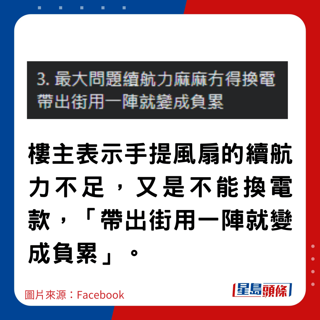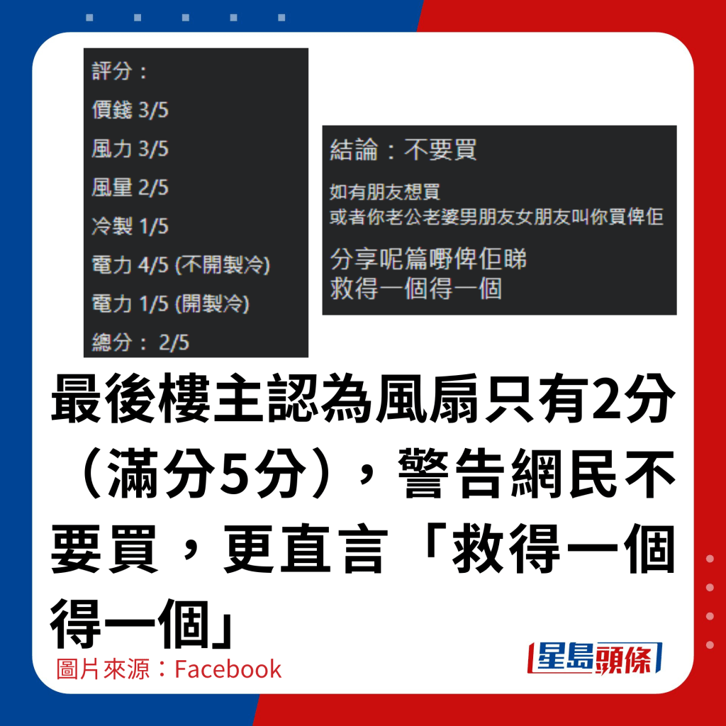 近日有網民在Facebook群組“黃金高登灣電旺電腦場情報關注組( 黃金商場/ 高登商場/ 旺角計算機中心/ 灣仔計算機城/ 298計算機特區)”發文,分享自己對M57制冷手提風扇的用后感,列出6點指該風扇只是“智商稅”,警告網民不要買,直言“救得一個得一個”,點擊圖輯看網民列舉6點勸勿購買!