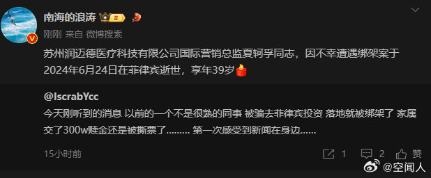 兩名華人在菲律賓遭綁架遇害,事件震驚各界。報道指,兩人從事醫療器械行業工作,分屬不同公司,其中一人夏某為中國公民,一人孫某為美籍華人,受自稱為“李娜”的經銷商邀請前往菲律賓談生意,抵達后卻遭綁架,6月24日被發現遇害。相關鏈接:華人孕婦在菲律賓落網,和丈夫合謀專門綁架中國人