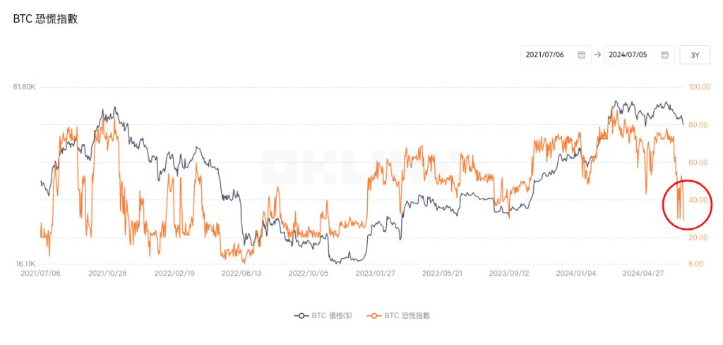 ▲比特幣貪婪恐慌指數低見29,1年半新低,意味市場十分恐慌。(資料:OKLink)