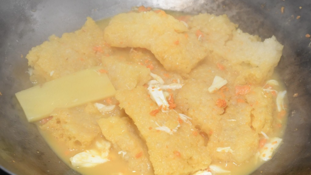 6. 起油鑊爆香蟹黃,注入蟹湯,加入蟹肉及魚肚煮滾,以生粉水埋芡。
