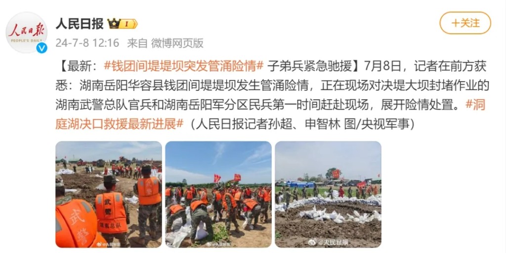 據湖南省水利廳專家表示,有300多名武警、消防員等搶險人員在專家指導下進行緊急處置,目前管涌險情暫時得到初步控制。