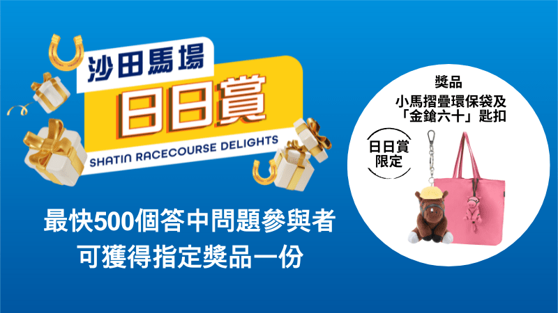 活動當日,大家更可以參加大抽獎贏取豐富禮物!只要在當日入場并于晚上7時10分打開“馬會投注三合一”應用程式,即可參加問答環節“沙田馬場日日賞”有獎游戲,首500名按指示最快提交正確答案的參加者,可獲得指定小馬折疊環保袋及限定版“金槍六十”匙扣,答中問題的參加者更可參加抽獎,有機會贏走指定旗艦手機一部及指定“金槍六十”珍藏紀念鑲畫一份!