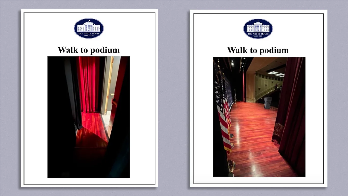 ▲美媒AXIOS取得白宮準備總統活動的文件范本,內容包含印有活動場地照片及用大字寫著“走上講臺”的文字。