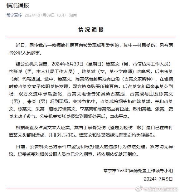 據九派新聞報道,常寧宣傳9日發通報,就6月30日發生的教師及公務員偷豆角事件,公開調查結果。