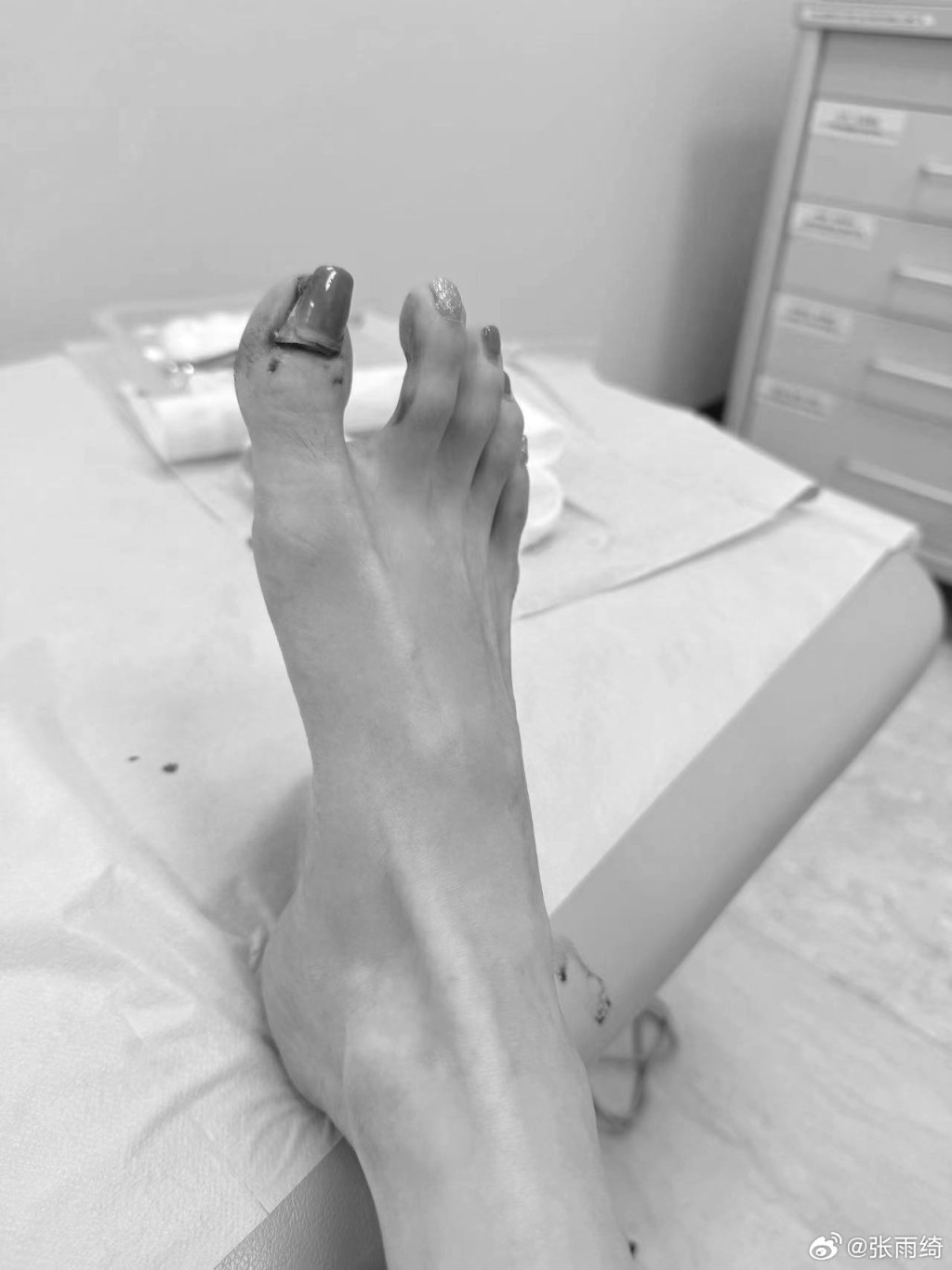 張雨綺日前在微博上載坐輪椅的照片,見到她的右腳拇指上有明顯的損傷,張雨綺透露穿涼鞋時不慎傷到腳趾,要將腳甲拔除。張雨綺貼出受傷及腳甲的照片留言:“其實沒事,只是拔了一個指甲蓋,朋友們別擔心!夏天穿露腳趾的鞋,大家千萬要小心!”