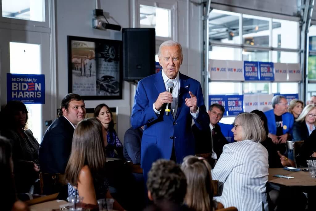 ▲美國總統拜登(中)12日在密歇根州一家餐廳內對支持者發表談話。(路透社)