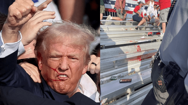 特朗普緊握拳頭示意自己無礙,現場一片狼藉。(路透社,X平臺)