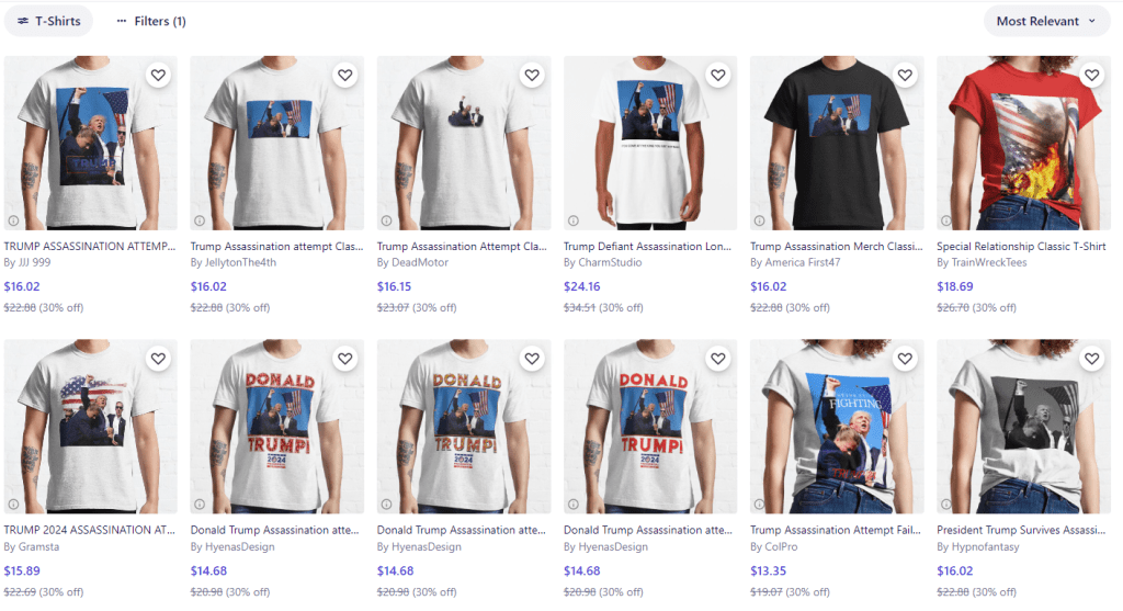 早前特朗普在競選活動集會上遇刺,槍手開槍造成一死兩傷。特朗普在事件中右耳受傷,離場前緊握拳頭向群眾致意。特朗普在治療傷勢后,稱自己不會投降。在不足一天內,美國有民眾把特朗普在事件中的形象造成T恤出售。