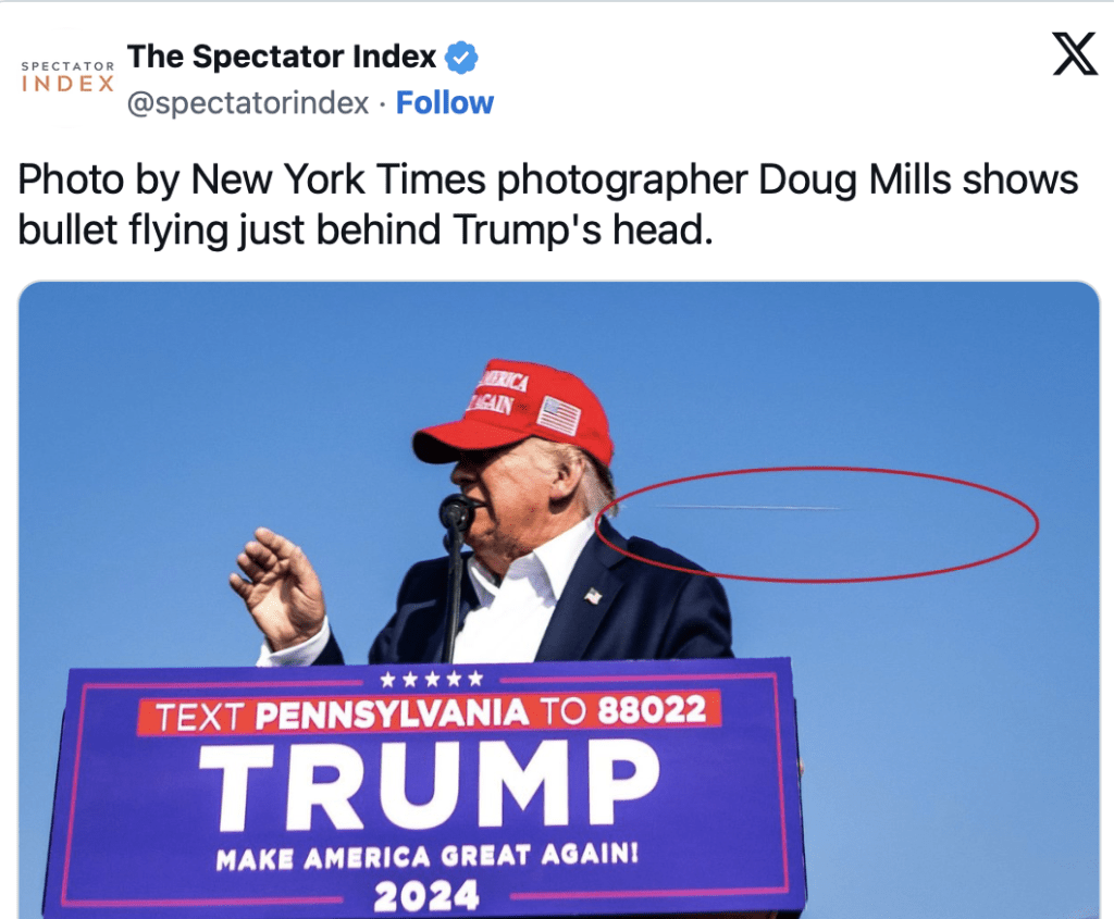《紐約時報》(The New York Times)資深攝影記者米爾斯(Doug Mills)疑似拍到子彈在特朗普頭部附近呼嘯而過的震撼畫面。社交平臺X截圖