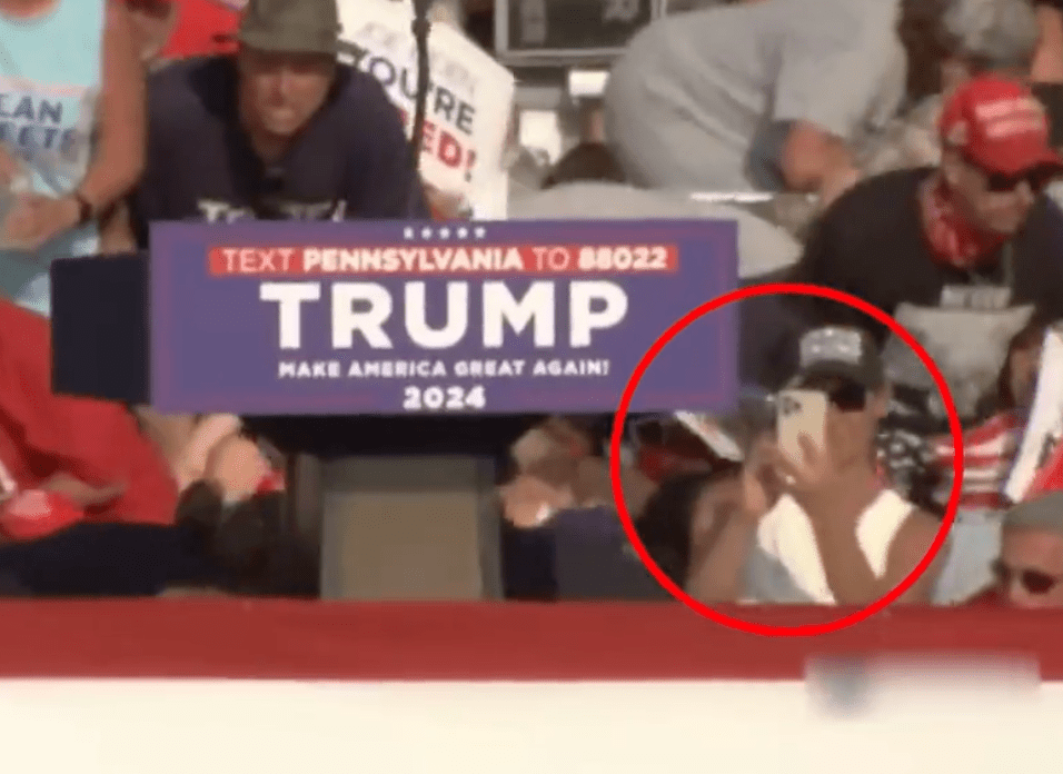 每日郵報報道,當時這名身份不明的女子就坐在特朗普身后不遠位置,戴著墨鏡、穿著白襯衫、戴黑帽子。當槍聲響起,特朗普和其他集會人士嚇得尖叫四竄,擔心自己的生命受到威脅時,這名女子卻冷靜得出奇,面部沒有任何表情,并馬上掏出手機,對住狼狽避險的特朗普狂拍攝。