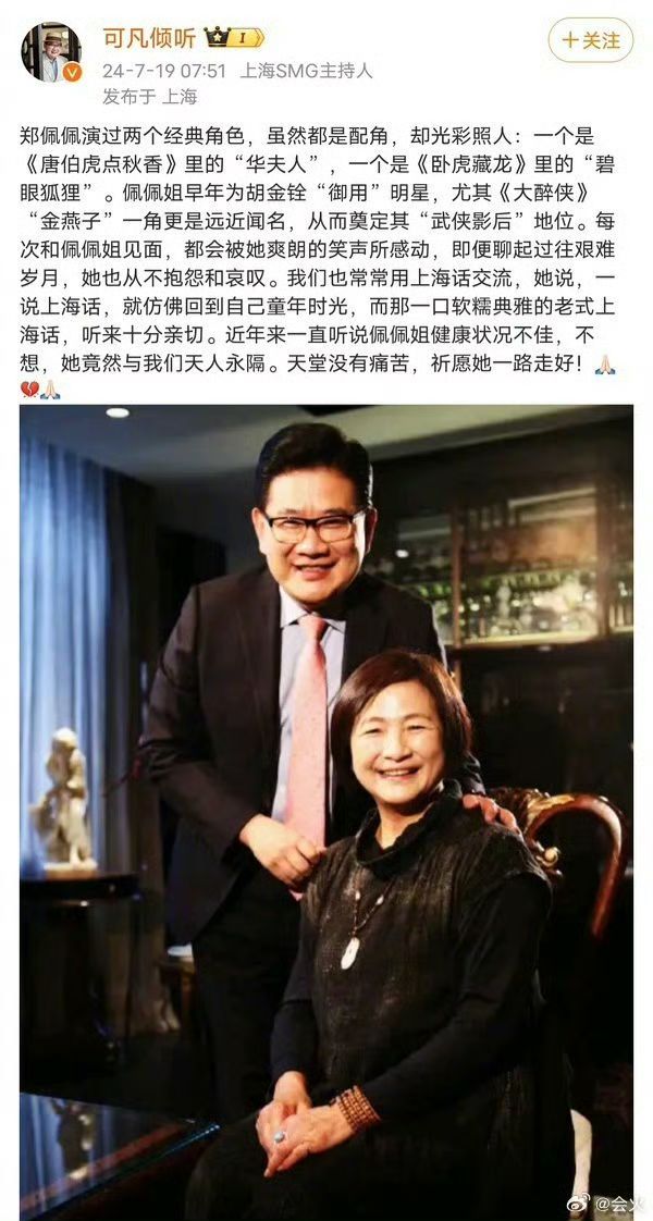 今日內地主持人曹可凡在社交平臺發文哀悼鄭佩佩,指她已經逝世,震驚娛樂圈。