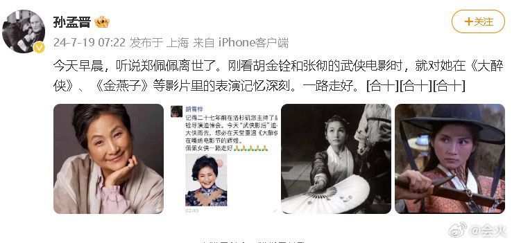 今日內地導演胡雪樺在社交網發文指鄭佩佩已經逝世,但未有交代其死因:“記得二十七年前,在洛杉磯,您主持了胡金铘導演追悼會。今天'武俠影后'追尋胡大俠而去,想必在天堂重溫《大醉俠》在戛納電影節的輝煌?!绷硗?,主持人曹可凡今日早上亦發文悼念鄭佩佩說:“每次和佩佩姐見面,都會被她爽朗的笑聲所感動,即使聊起過往艱難歲月,她也從不抱怨和哀嘆。我們也常常用上海話交流,她說,一說上海話,就仿佛回到自己童年時光,而那一口軟糯典雅的老式上海話,聽來十分親切。竟然與我們天人永隔?!?/p>