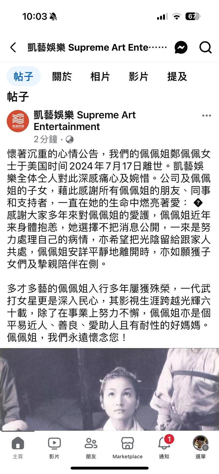 ▲凱藝娛樂其后發聲明證實鄭佩佩死訊。